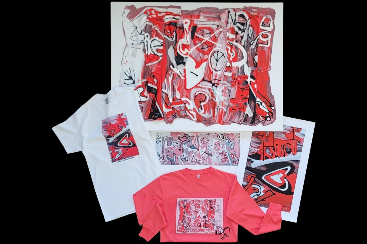 At DomDom, Inc., we offer a concept with a unique perspective revolving around and stemming from an original 3D Acrylic Painting. Our concept and unique perspective are offered in a variety of what is called a "Full Artist Set" (pictured in this section). Each piece of artwork and or merchandise stem from any given 3D Acrylic Painting. The merchandise within any given Full Artist Set also includes a logo(s) revolving around the artist's name. This allows our Brand the opportunity and the ability to offer multiple perspectives and options of owning a beautiful one-of-one (one-off) piece of art and or wearable art, outside of owning an original 3D Acrylic Painting. Also allowing, the Brand and the artist to consistently offer new unique perspectives, new works of art, and or merchandise to the consumer that are rare and collectable.